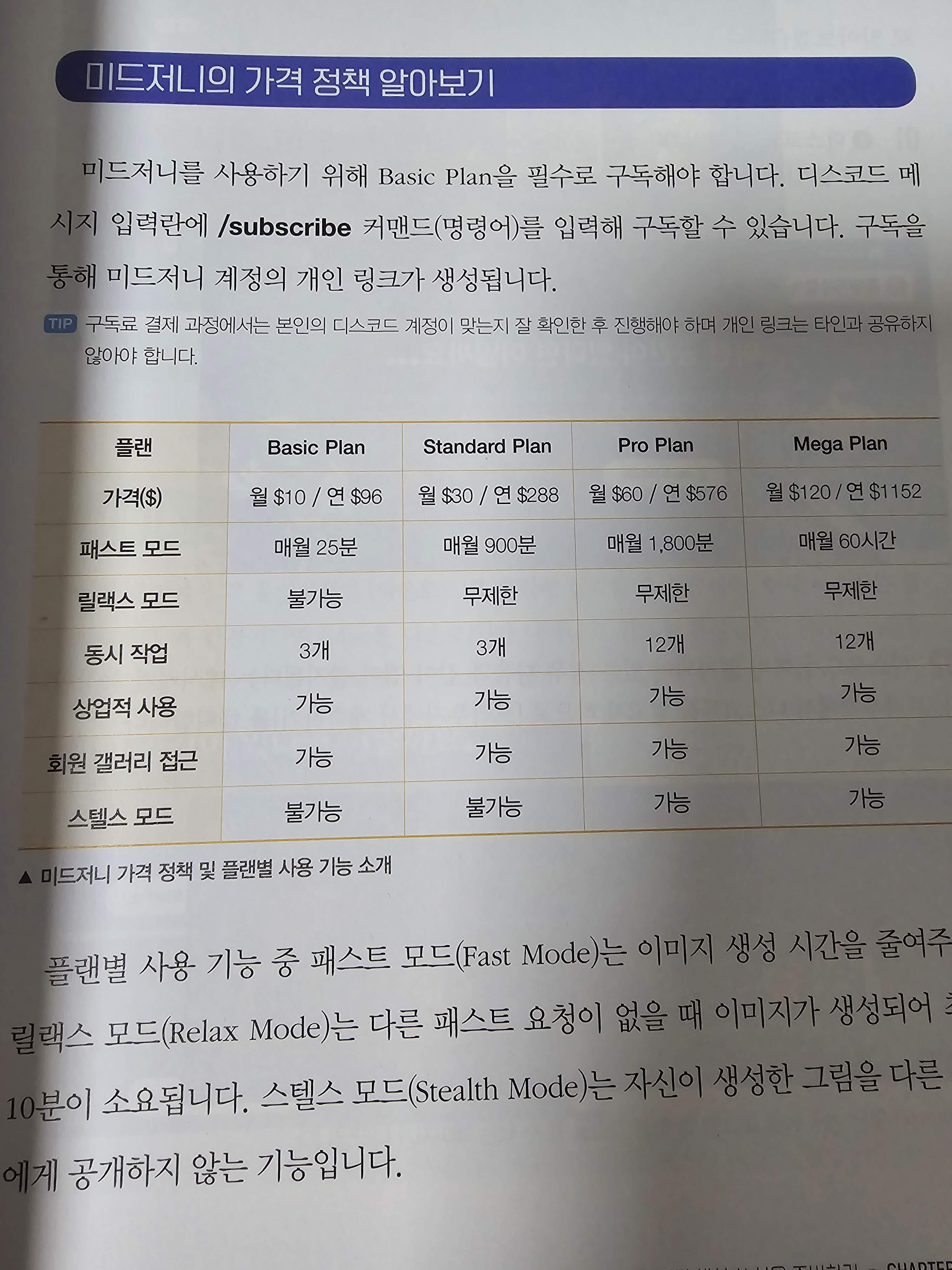 이 책은 실제로 결제를 하는 데 부담이 없는 사람만 읽는 편이 낫다고 볼 수도 있을 정도로, 미드저니 최소 요금제라도 결제를 하고 진행하는 것이 좋다. 그렇지 않으면 Discord에서 미드저니로 넘어간 다음 실제 이미지 생성까지는 하지 못하고 좌절할 것이기 때문이다. 사실 이미지 생성하는 것이 이 책의 주목적이었다면, 스테이블 디퓨전을 좀 더 비중있게 했다면 어떨까 싶었다. 굳이 치자면, 스테이블 디퓨전 30퍼센트, 달리 10퍼센트, 미드저니 60퍼센트 정도면 충분했을 것 같다. 그만큼 무료로 문턱을 낮춘다음에 미드저니로 접하게 했다면 좋았을 것 같다.