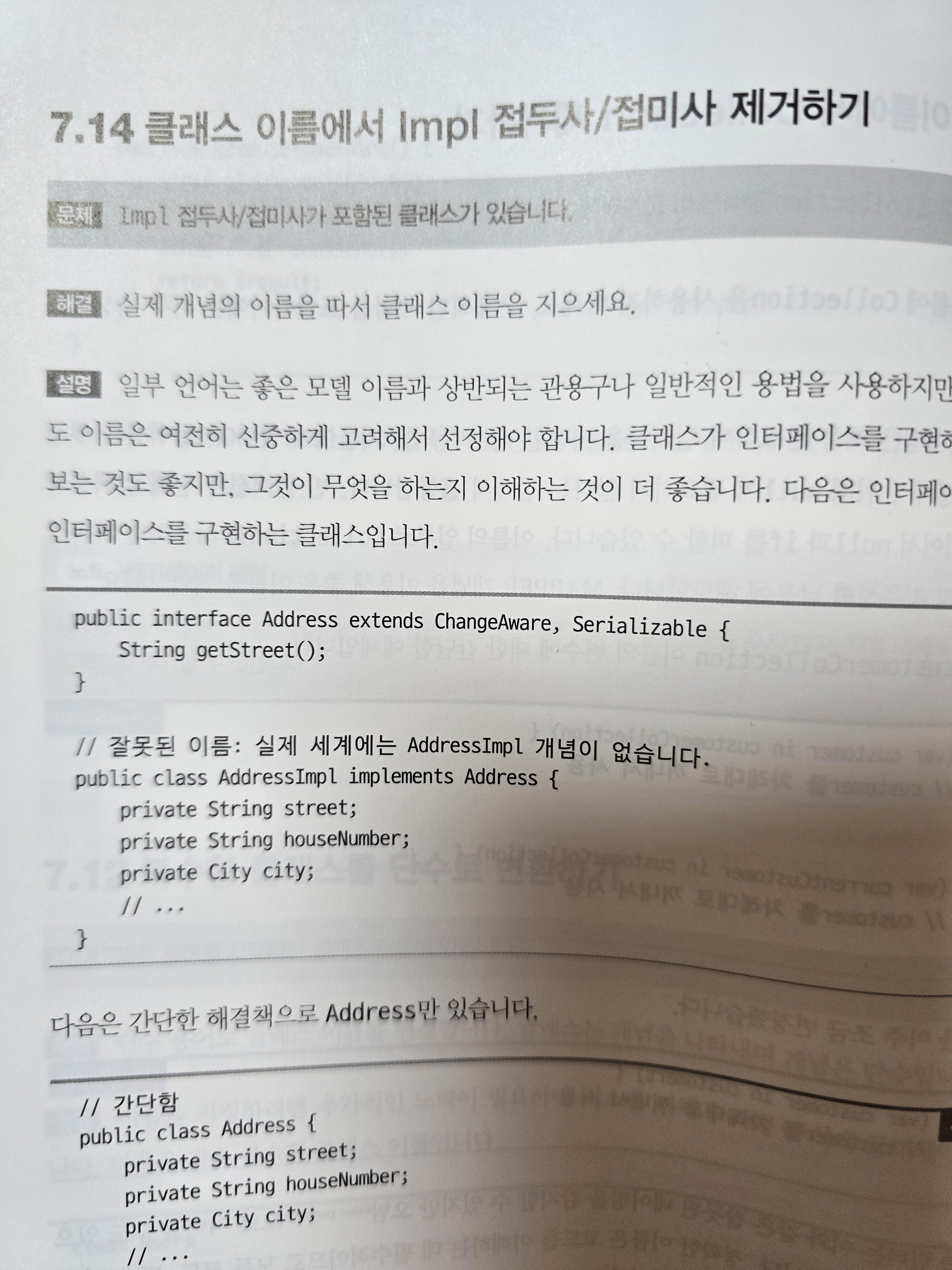 인터페이스는 I 접두사를 붙이고, 그것을 구현하는 구현체는 Impl 접미사를 붙여서 해당 인터페이스의 구현체임을 표현하는 방법에 사용한다. 하지만, 여기에서는 실제 세계에서 하나의 개념에 인터페이스와 Impl의 개념이 혼재하여 사용되지는 않기 때문에, 실제 세계에서 사용할 법한 이름으로 사용하기를 권하는 것이다.