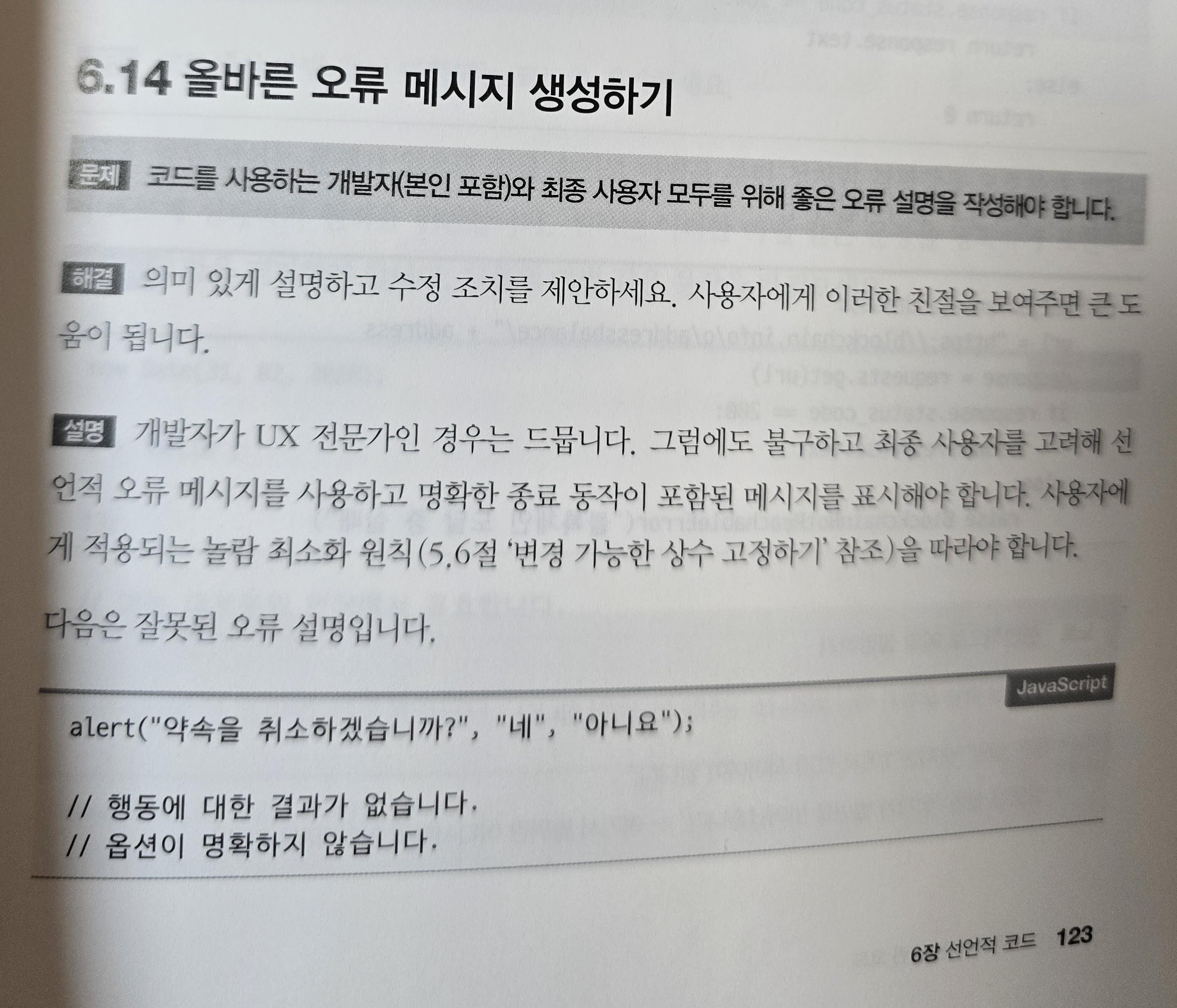 오류메시지 생성과 관련해서는 생각이 많다. 이 또한 사용자 위주(User Friendly)의 프로그램을 개발한다면, 당연히 메시지는 친절해야 한다. 하지만, 뭘 그렇게 숨기고 싶은지 오류가 발생했다는 정도로만 보여주는 경우는 매우 드물며 그래도 내부 트래킹은 편하게 하고 싶은 생각에 오류코드는 함께 출력하는 경우가 많다. 또한 메시지 뿐 아니라, 선택하는 버튼도 일률적으로 확인/취소 정도만 제공하는 경우가 많은데, 이것으로는 의미를 해석하기 어려운 경우도 많다. 그래서 사용자의 관점에서 뭘 하라는 것인지 명확히 알아야 서로 피곤함을 덜 수 있지 않은가. 그래서 이런 부분에서도 깊이 생각하고 개발할 필요가 있다는 부분에서 깊이 공감하였다.(물론 이것은 UX/기획 측면에서의 역할이 더 크기는 하다. 하지만 개발자도 방치하면 안된다.)