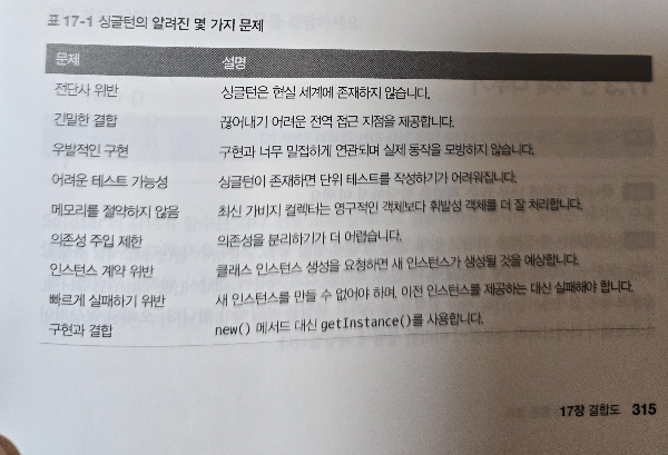 - 테스트 주도 개발 기법을 적용하기 더 어려움, 상황에 맞는 고유한 개념, 멀티 스레드 환경 문제, 가비지 상태 누적, 클래스 단일 책임 위반/관심사 분리(SoC), 쉬운 접근 지점, 의존성 지옥, 유연성 부족, 수명주기관리의 어려움