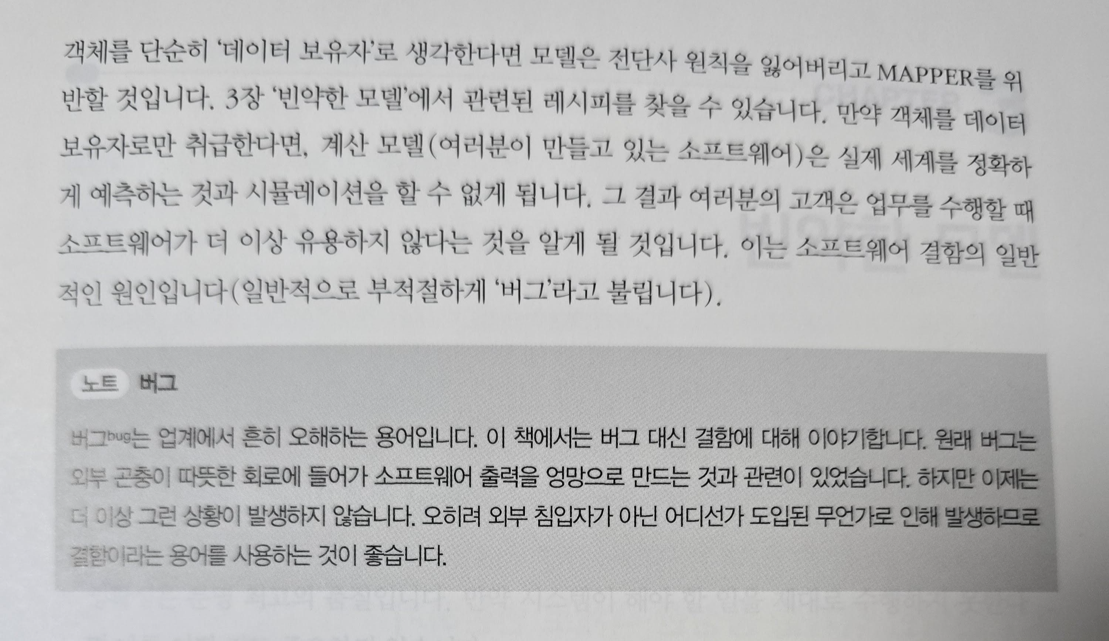 하지만, 버그란 외부에서 준 요인에 의해 의도치 않은 동작을 일으킨 것이기 때문에, 코드의 부적절성으로 발생한 현상은 엄밀히 말하면 결함(Defect)이라고 하는 것이 맞다.