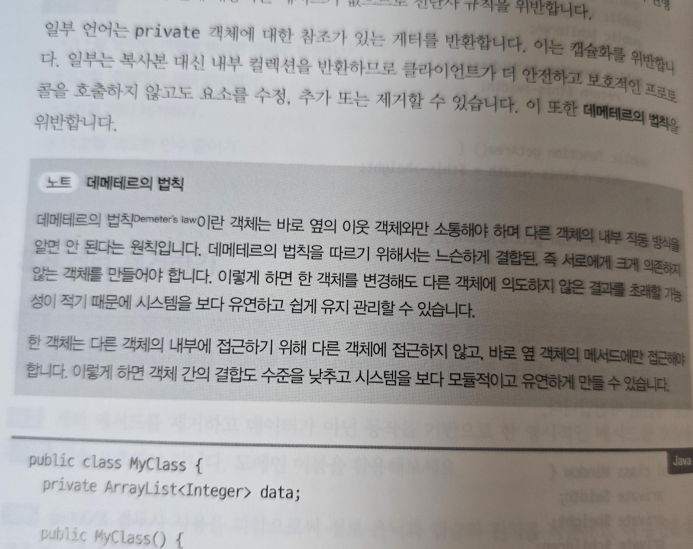 서로간의 관계가 느슨하게 하기 위해 노력해야 한다고 생각한다. 그래서 각 클래스나 인터페이스의 접점(호출부)이 간결하게 되어있는 것을 선호한다. 불가피하게 많이 참조하게 된다고 하더라도 그에 합당하게 읽혀지는 것을 선호하는데, 그에 대한 용어를 처음 알았다. '데메테르의 법칙'이다.