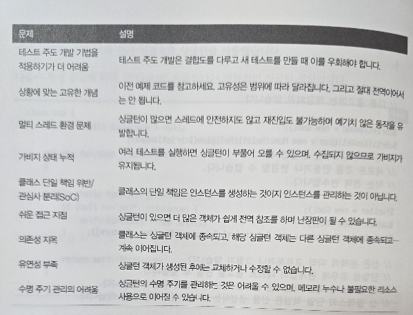- 테스트 주도 개발 기법을 적용하기 더 어려움, 상황에 맞는 고유한 개념, 멀티 스레드 환경 문제, 가비지 상태 누적, 클래스 단일 책임 위반/관심사 분리(SoC), 쉬운 접근 지점, 의존성 지옥, 유연성 부족, 수명주기관리의 어려움