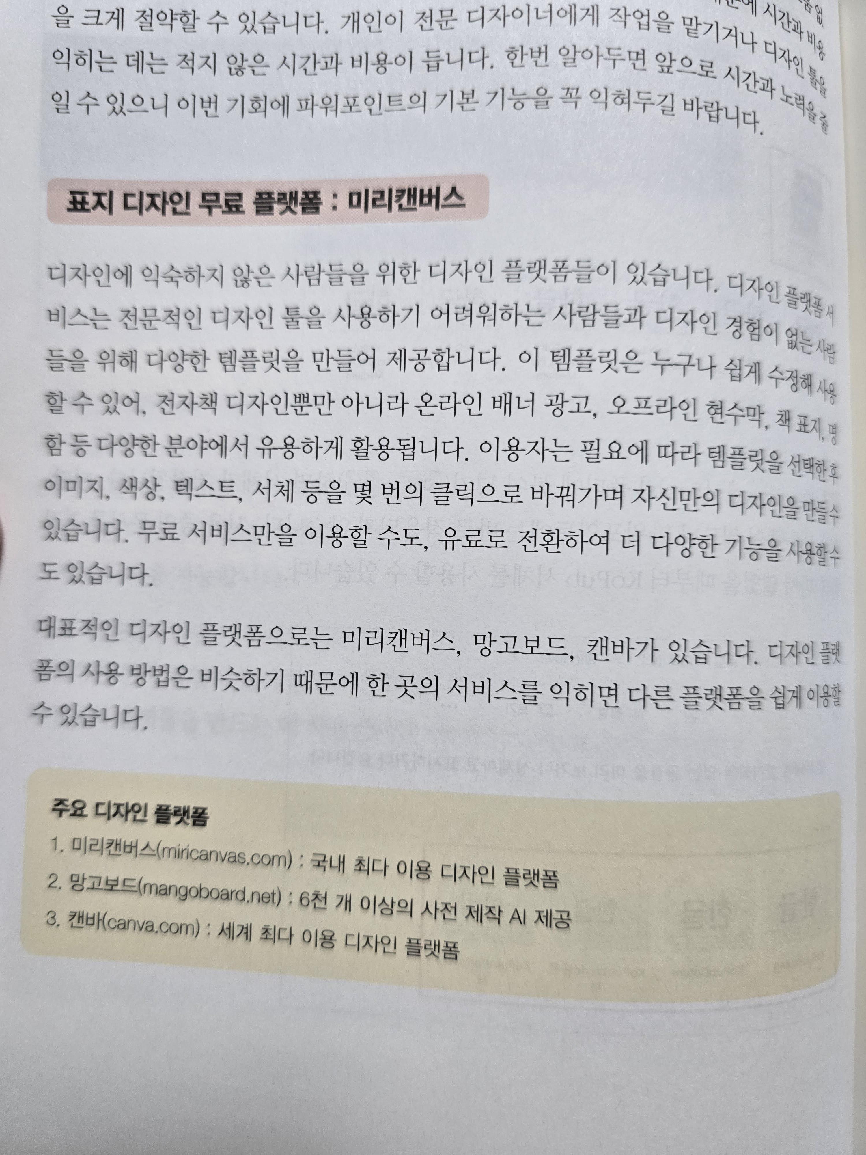 표지 디자인을 어떻게 하는 것이 좋을지 막막한 사람에게, "포토샵으로 잘 만들어봐" 라는 말보다, 그것을 잘 만들 수 있는 사이트를 소개하고, 간단한 사용법을 알려주는 것이 훨씬 효율적이다. 이 책에서는 미리캔버스를 예시로 설명하고 있다.