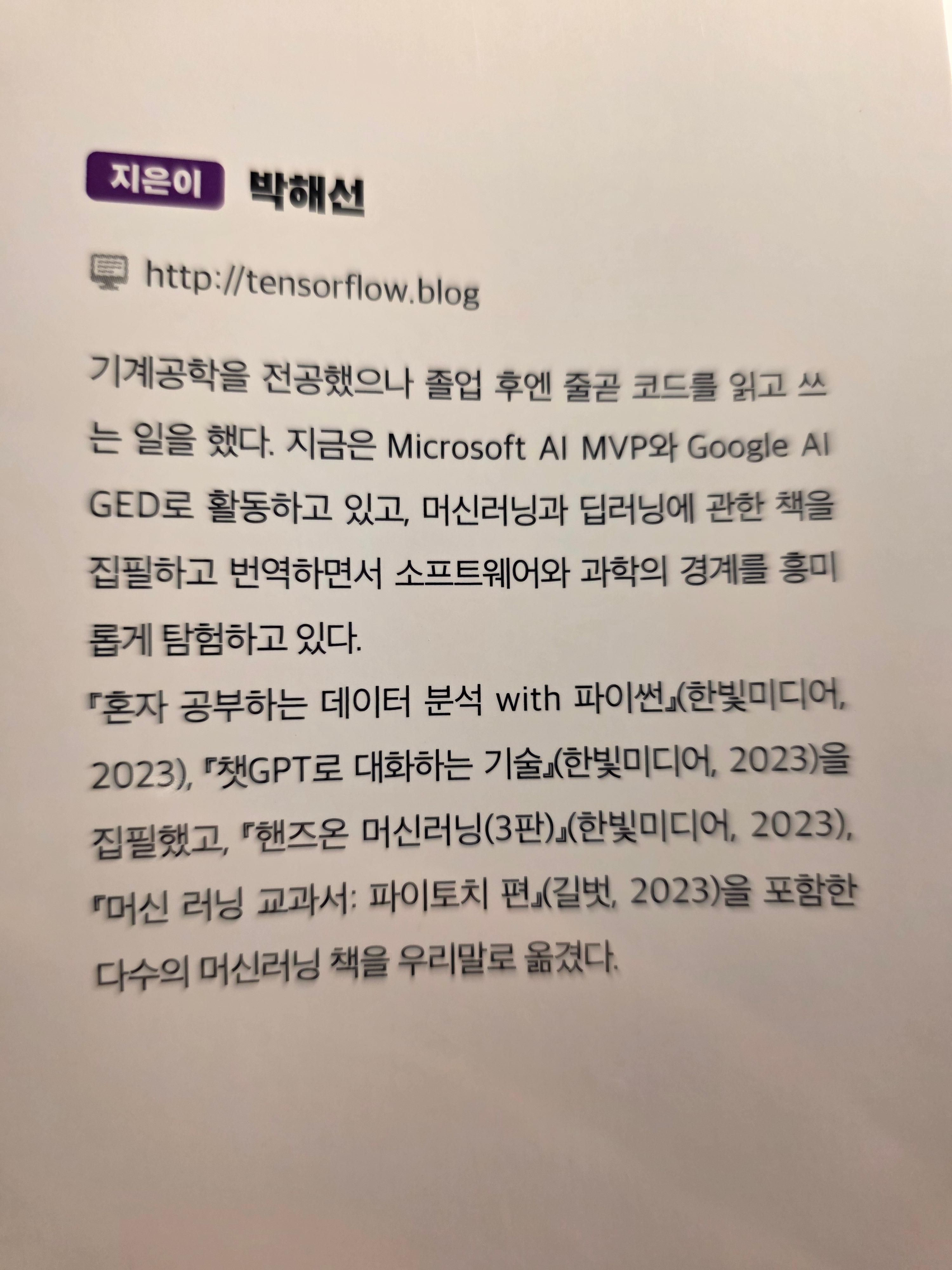 마지막으로 이곳에 있는 작은 옥의티가 있어서 이 부분을 언급하자면, 저자의 이력에서 Google AI GED로 활동한다고 적혀있는데, GED가 아닌 GDE(Google Developer Experts, https://developers.google.com/community/experts)이다. 혹 나중에 다시 인쇄할 일이 있다면 고쳐졌으면 좋겠다.
