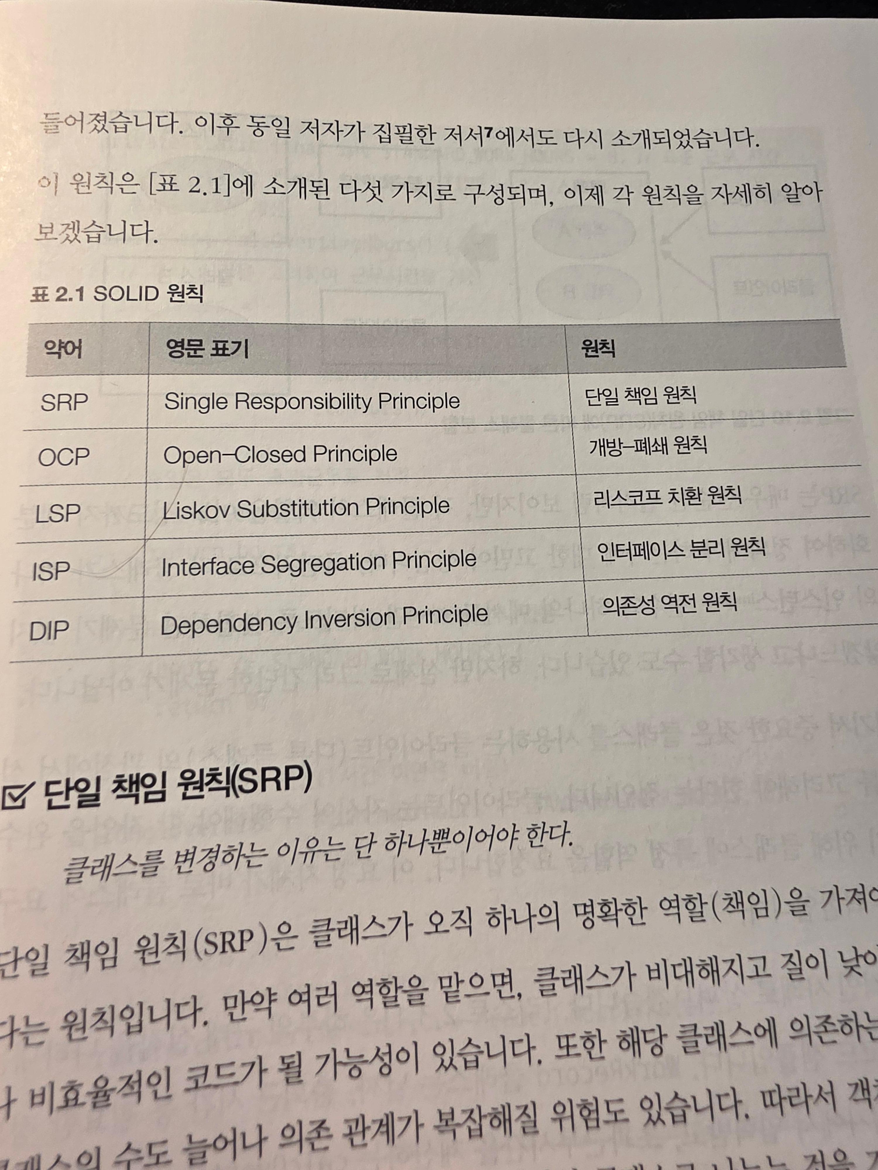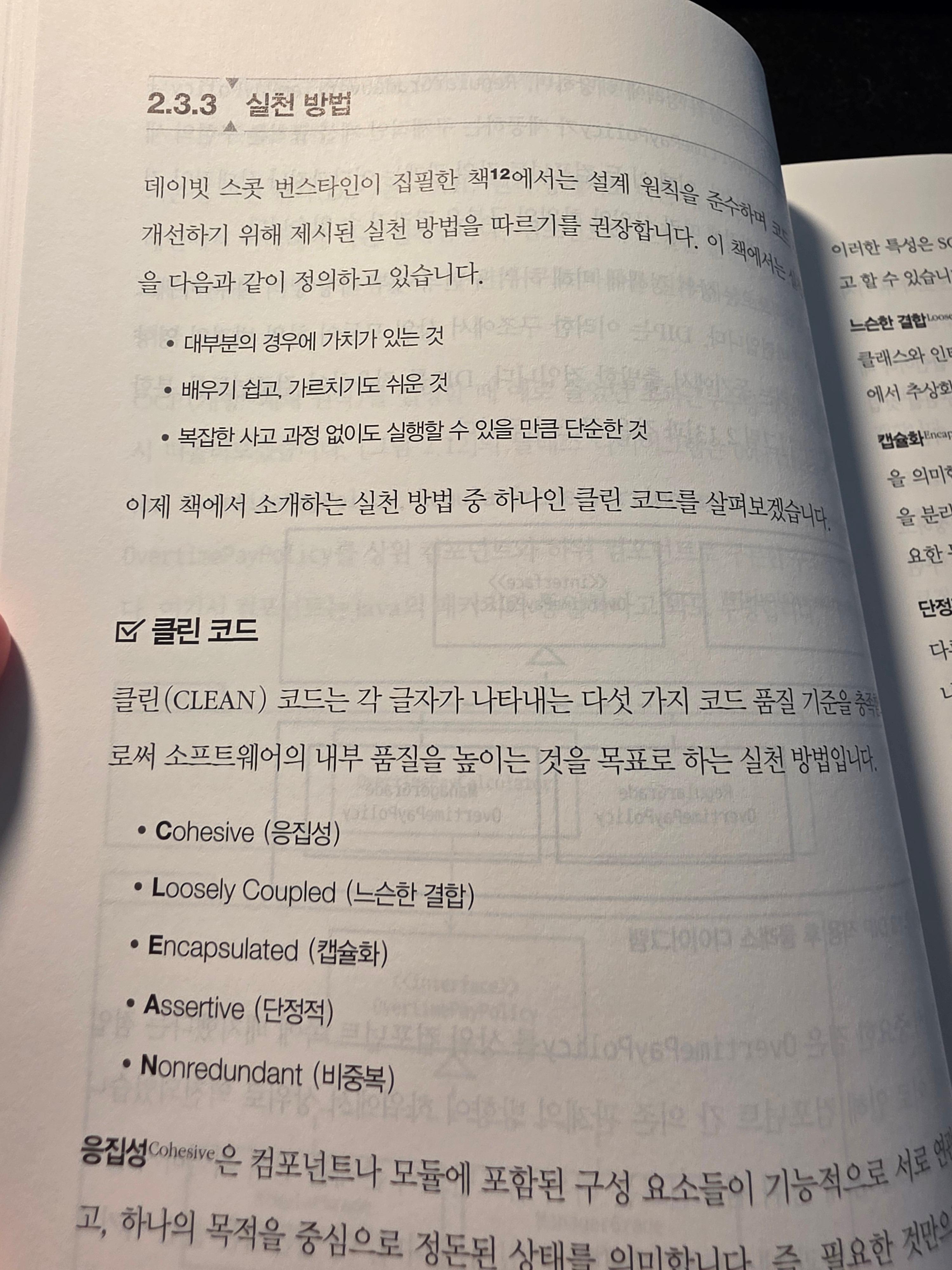 공부에 자주 쓰이는 개념들이 있어서 반가웠다. SOLID 원칙과 클린코드. 특히 클린코드는 CLEAN에 각각 의미를 담아서 기억하기에 좋다. 일단 SOLID원칙을 설명하면서는 단순히 설명만 담지 않았다. 각각의 예시와 그에 따른 코드 스니펫도 함께 담아두었다. 코드는 자바로 되어있어서 읽기 편했다. 특히 각 개념을 적용하기 전과 후의 비교 코드를 같이 수록해 두어서 개념이 좀 더 명확하게 와 닿았다.