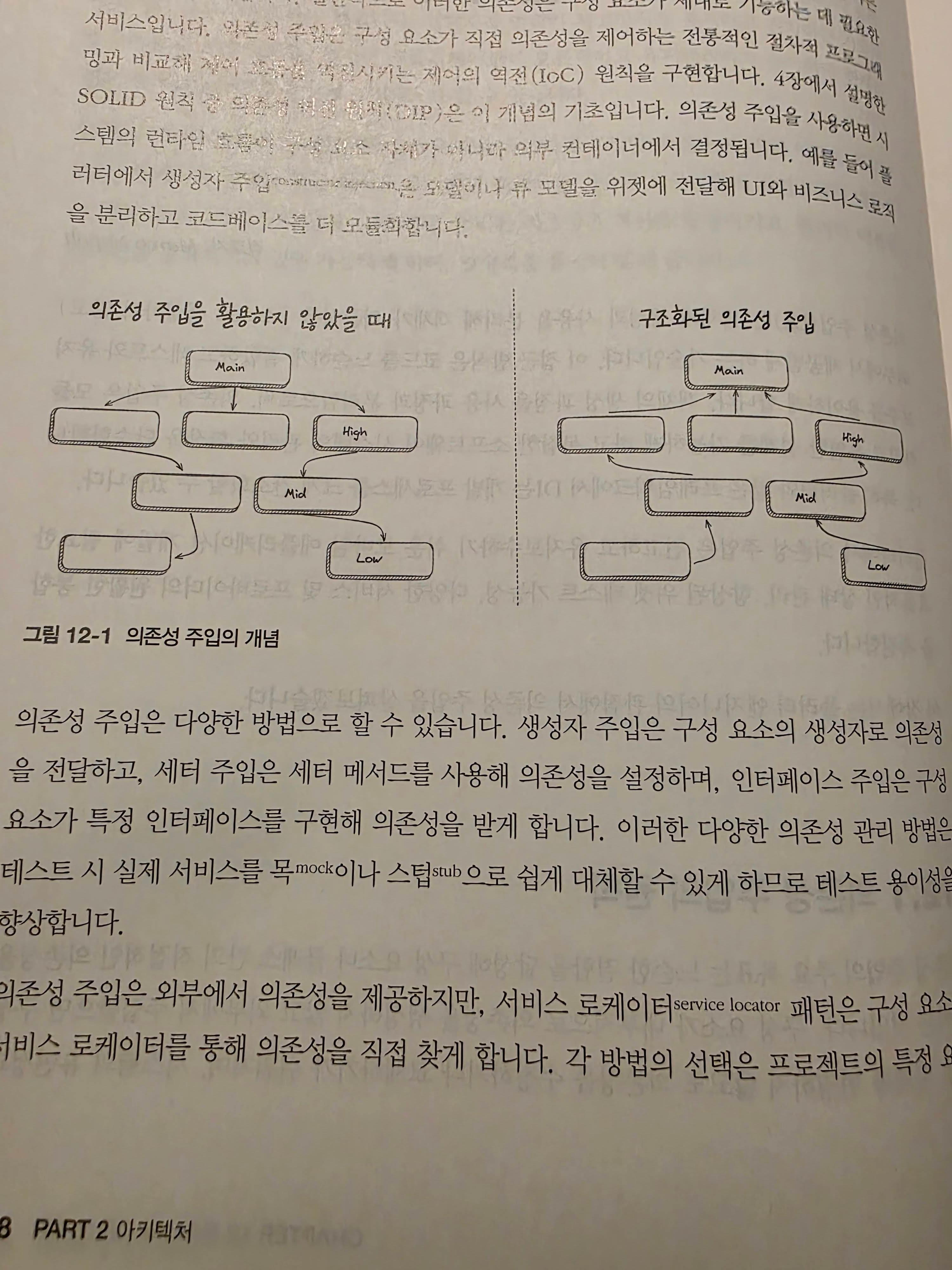 DI를 비롯하여 SOLID 원칙에 대한 이야기를 다루고 있으며, 다만 이런 부분은 간략하게 소개하고 있다. 이 내용만으로도 다른 책 한 권의 분량이 되기 때문일 것이다.