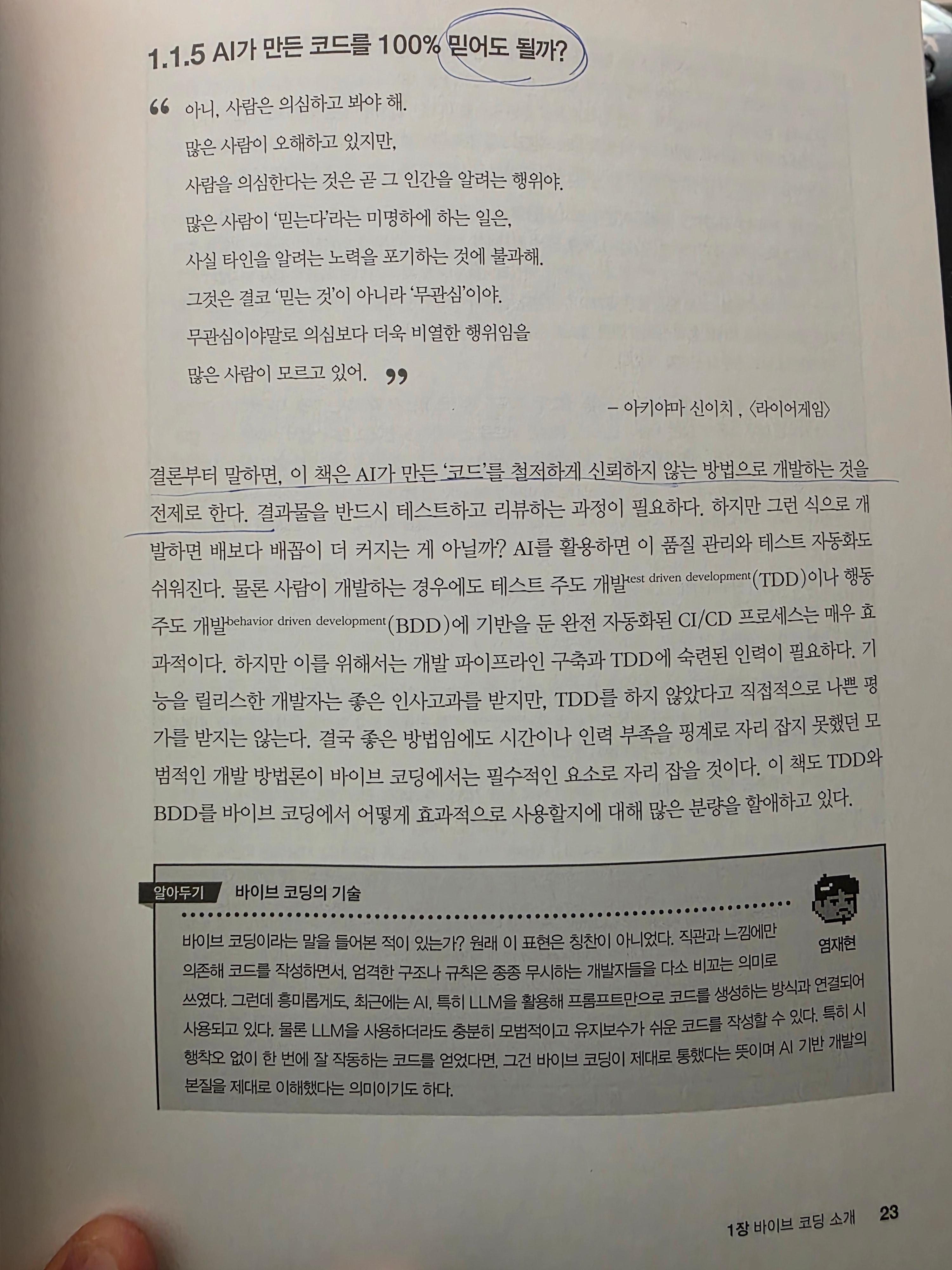 먼저 AI가 작성한 코드를 믿어도 되는지에 대한 의심이 누구나 들 수 있다. 정확한 것이 아닌 확률에 의해 하는 느낌이라 더욱 그렇게 느낄 수 밖에 없다. 그래서 오히려 이것을 믿으라고 하는 것이 아닌, 철저하게 신뢰하지 않는 방법으로 개발하는 것을 전제로 하고 있음을 강조하고 있다. 그래서 그것을 TDD 등으로 신뢰성 있는 프로그램으로 보완할 수 있도록 해야한다고 말한다.