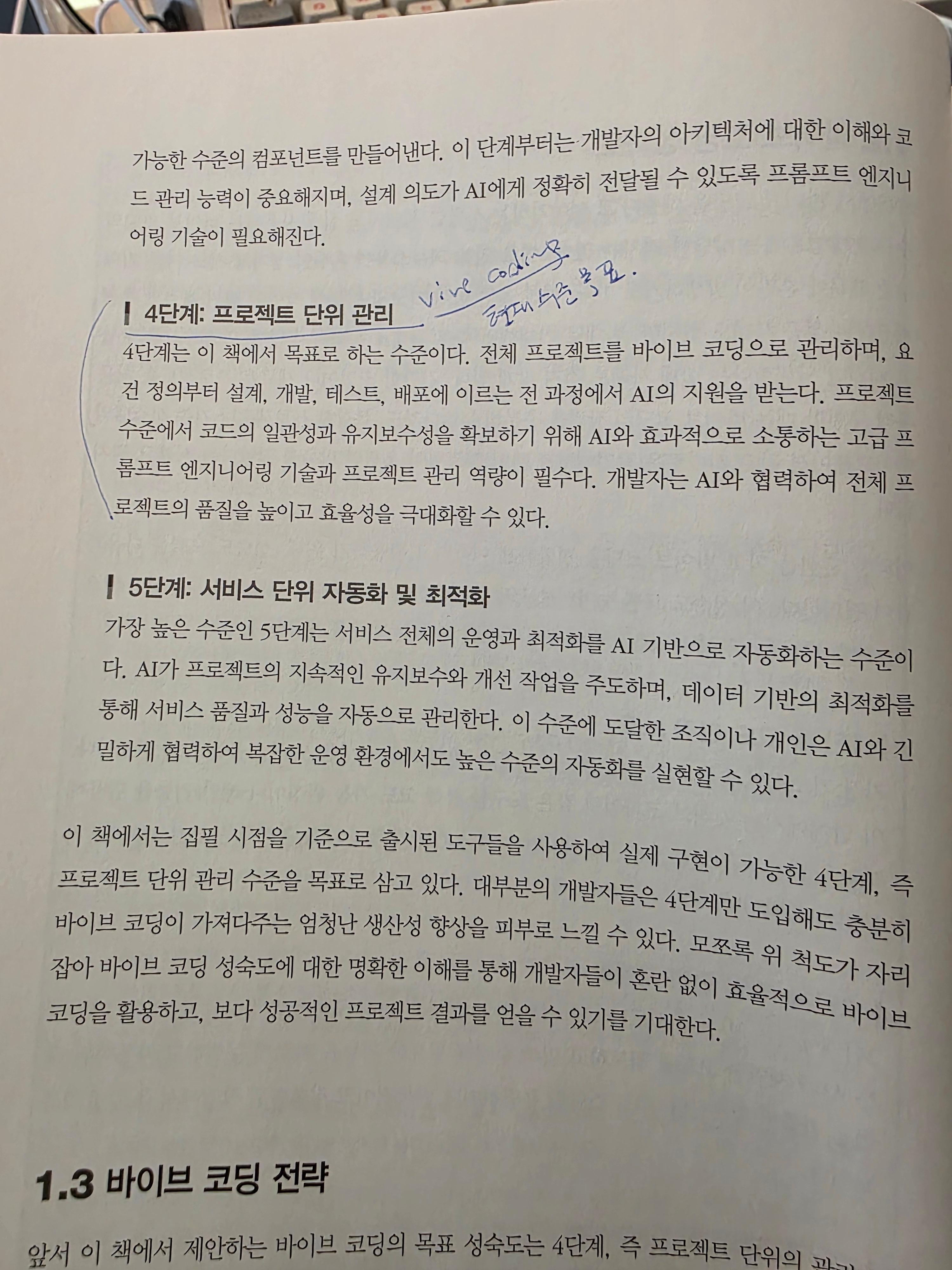 이런 바이브 코딩을 실습하며 학습하게 될 텐데, 그 목표를 4단계인 프로젝트 단위 관리로 잡고 있다. 전체 프로젝트를 바이브 코딩으로 관리하며, 요건 정의부터 배포에 이르는 과정까지 AI의 지원을 받는다. 개발자는 AI와 협력하여 전체 프로젝트의 품질을 높이고 효율성을 극대화 할 수 있도록 할 것이다. 이정도만 해도 사실상 배포의 자동화 바로 전 단계이기 때문에 모든 것을 목표로 한다고 해도 과언이 아니다.