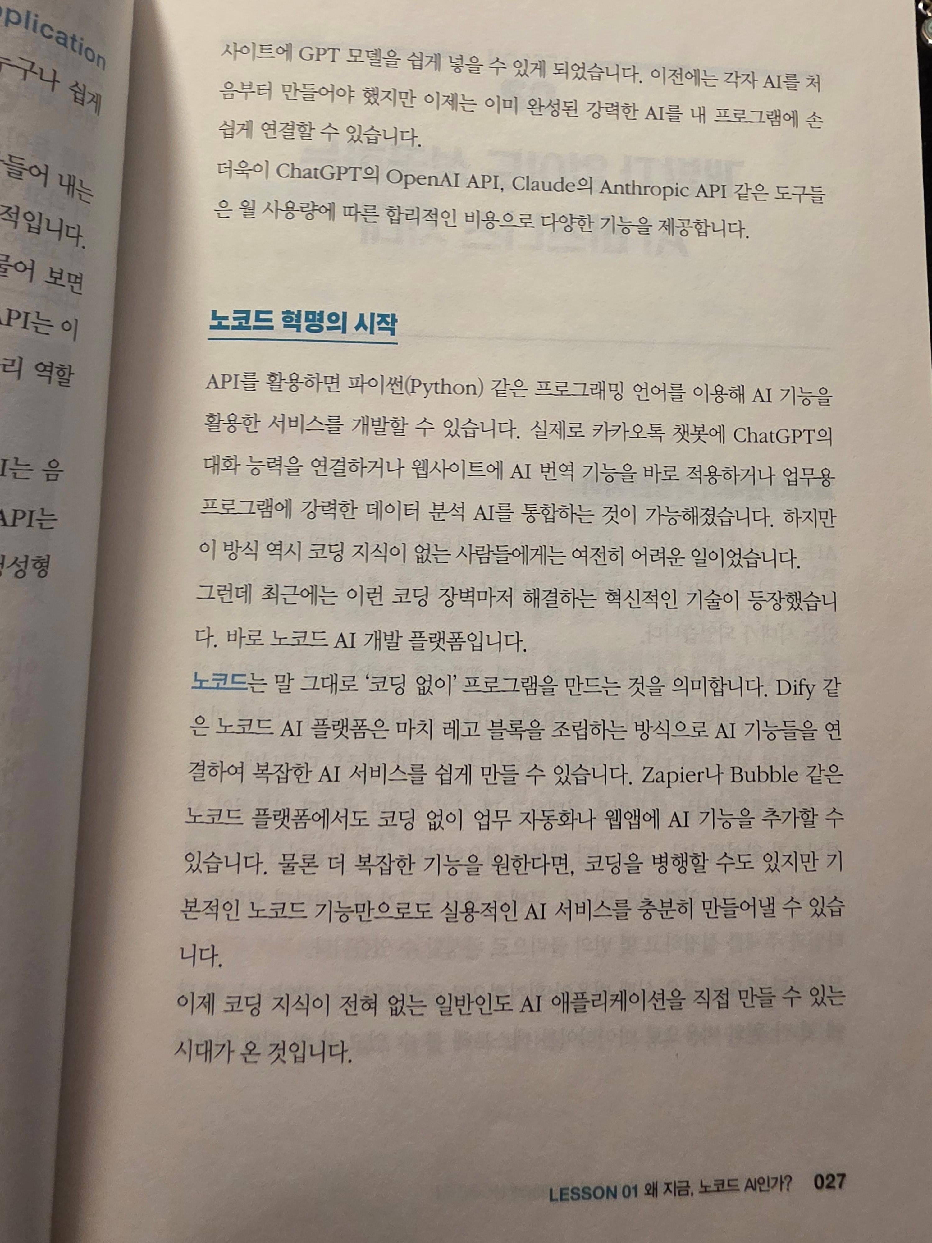 노코드 자체에 대해 알려주는 부분이다. 노코드라는 말에 대해서 알아야 Dify를 이해할 수 있기 때문이다. 사실 코딩을 도와주는 코딩 에이전트라는 강력한 AI툴이 다양하게 존재하지만, 이것 역시 개발 지식이 하나도 없다면 할 수 없기 때문이다. 코딩이라는 것의 정의가 먼저 필요한데, 코딩은 내가 원하는 작업을 일련의 프로세스로 만들어서 루틴화하여 동작시키도록 만드는 과정이다. 이것을 하기 위해 컴퓨터가 이해할 수 있는 언어와 프레임워크를 이용하여 작업하는 행위인데, 이 행위 없이 앞세 나열한 내가 원하는 작업을 일련의 프로세스로 만들어서 동작시킬 수 있다는 의미로 해석된다.