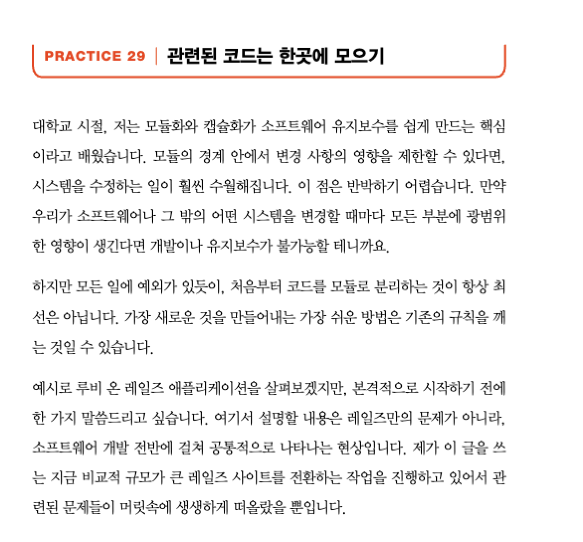 방정리를 잘하고 싶은데 방정리를 어떻게 하는 것이 효과적이고 대중적으로 좋은 방법인지 몰라서 한번 쯤은 책이나 영상을 찾아본 경험이 있을 것이다. 이 책도 마찬가지이다. (가만히만 두어도) 한 스프린트가 지날 때마다 내 프로젝트가 점점 복잡도가 올라가는 것을 경험한 적이 있을 것이다. 이제는 한번 쯤 프로젝트를 돌아볼 때 어떻게 어떤 관점에서 봐야 하는지, 좋은 가이드가 된다고 생각한다.