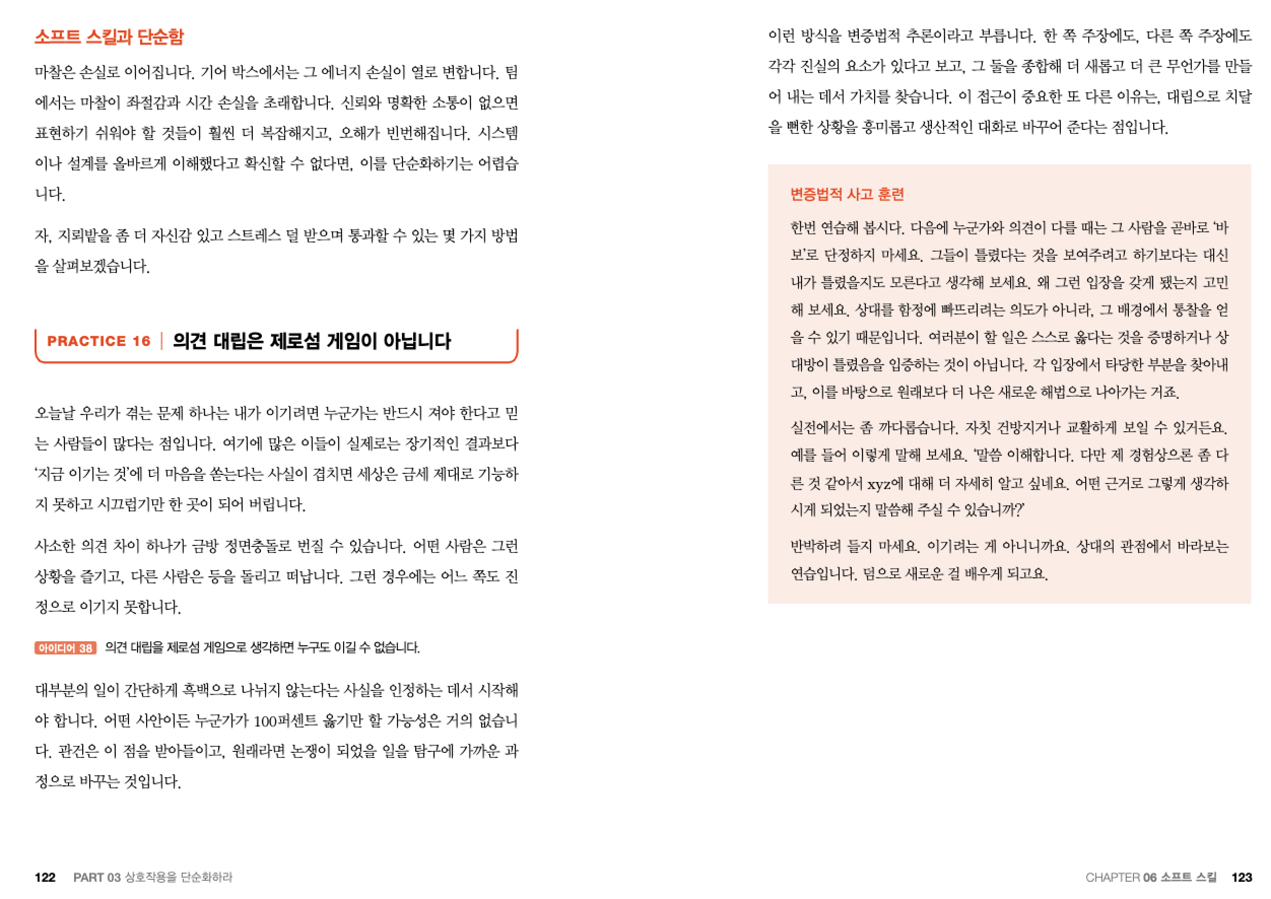 앞에서 이야기 했던 것들이 작업 내용과 관련된 미니멀리즘을 향한 일이었다면, 이제는 주제를 좀 돌려서 의견 교환에 대한 이야기를 다룬다. 의견 교환은 좀 더 순화한 말이고, 대부분은 의견 대립으로 말할 수 있다. 의견 대립이 발생하면, 그것을 회피하든, 내 의견을 강하게 피력하는 것이 일반적인데, 이 책에서는 변증법적 사고 훈련에 대해 이야기 하는 부분이 인상적이었다.